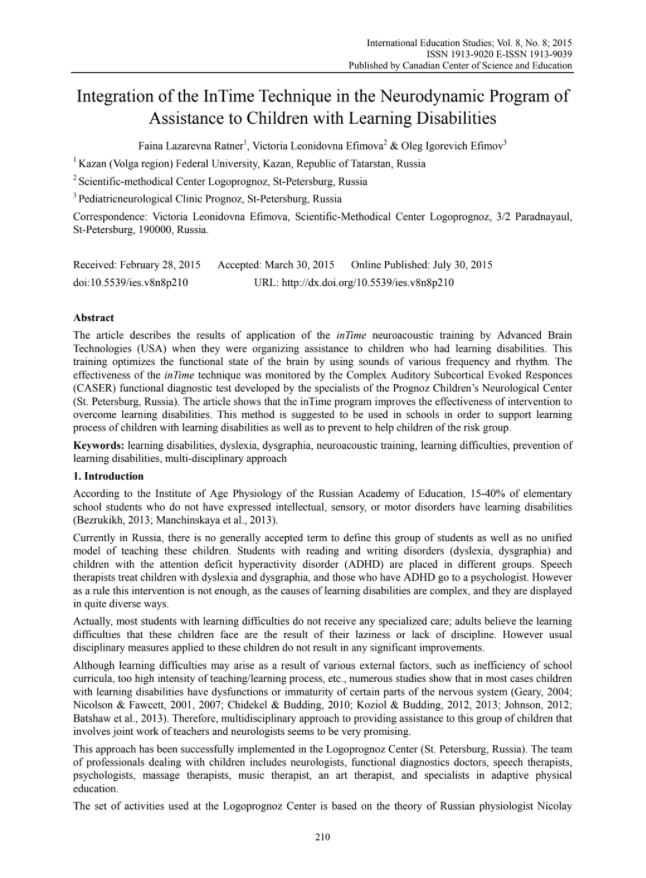 Integration of the InTime Technique in the Neurodynamic Program of Assistance to Children with Learning Disabilities